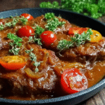 Bring the mixture to a gentle simmer. Once bubbling, reduce the heat to low, cover the skillet, and let it cook slowly for about 1.5 to 2 hours. Slow cooking breaks down the tough fibers in the meat, making it tender and juicy, while allowing the flavors to meld beautifully.